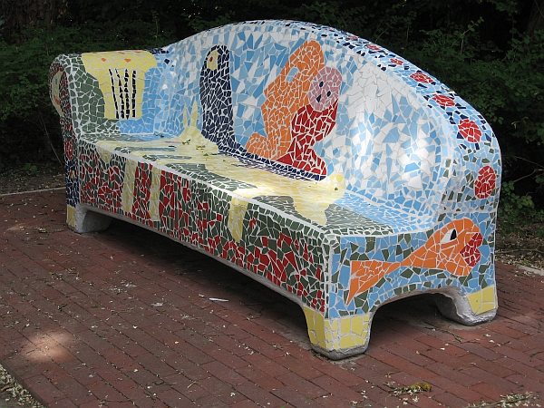 Betonnen banken.Op initiatief van de RIBW Gooi & Vechtstreek door de bewoners bekleed met mozaïek. Begeleiding door kunstenaar Job Bisscheroux Onthulling op 4 juni 2010