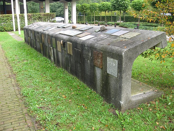 Ingang Wereldomroep, Witte Kruislaan 55, Hilversum1961 Op initiatief van R. Vogels, onderdirecteur van de KLM heeft de werelomroep 91 landen uitgenodigd een stuk natuursteen in te zenden.