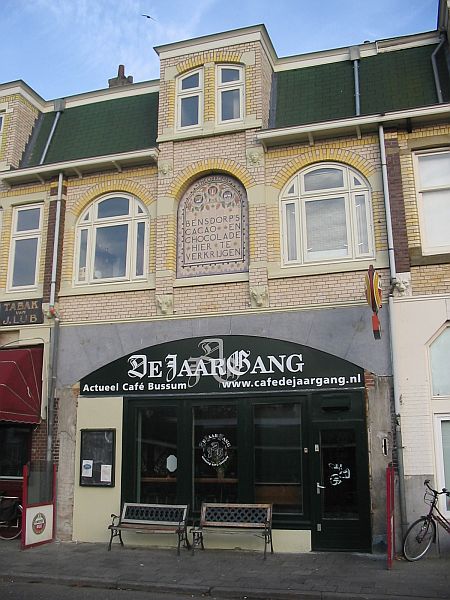 Op nr 6 tegeltableau met de tekst "Theobroma" (Amsterdase firma in koffie- en cacaobonen) en daaronder de wapens van Venezuela, Java en Colombia.