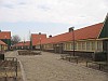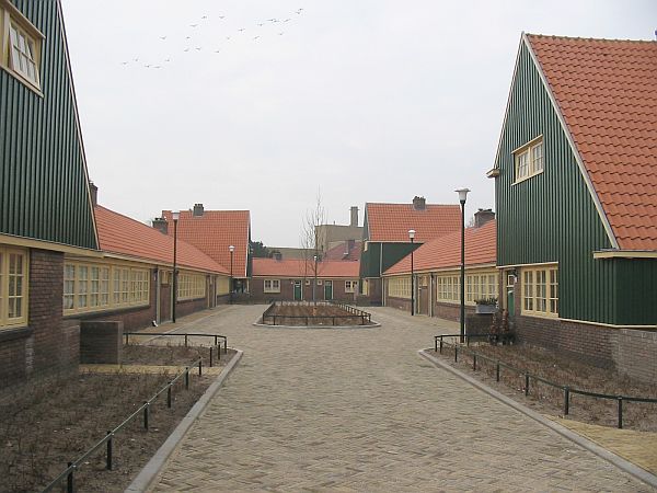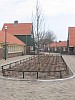 Klein complex in vorm van hofje: smalle straat met in het midden een klein gazon.