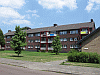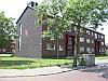 De naar elkaar toegekeerde kanten van de flats hebben dezelfde kleur metselwerk.
