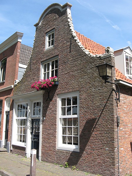 Pand uit overgang 17e-18e eeuw. Klokgevel met gebogen natuurstenen randen met bloem- en vrachtmotieven.
