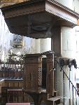 ![]() | Preekstoel Uit de 17e eeuw. Bij de restauratie bleek deze om de oude preekstoel uit de 15e eeuw te zijn heengebouwd. Deze laatste staat nu in het koor. |