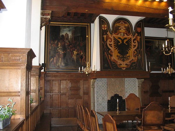 Op de begane grond de hal en daarachter de Schepenkamer.