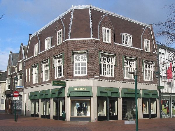 Voor de winkel, in de Kerkstraat, het beeld "Kind op pony" van Hans Bayens, 1971