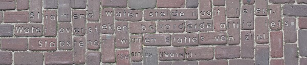 Het kunstwerk bestaat uit een brok graniet, afkomstig uit een Zuid-Franse steengroeve. Het ligt verzonken in de bestrating, overstroomd door een vlies water, met in de klinkers daaromheen aangebrachte versregels van Seamus Heaney, Gerrit Kouwenaar en Peter Lievaart.