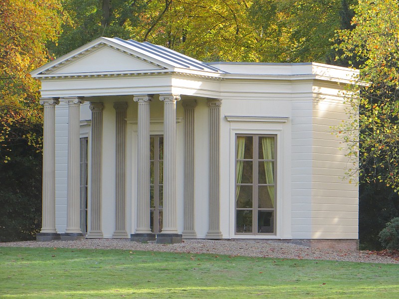 Achter het landhuis Schaep en Burgh ligt de biljardzaal, het Capitool, naar een ontwerp van J.D. Zocher jr.